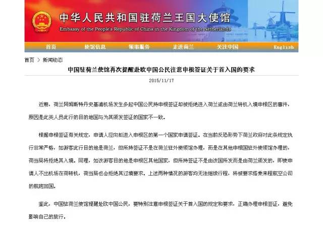 鉴此,中国驻荷兰使馆提醒赴欧中国公民,要特别注意申根签证关于首入国的规定和要求,正确办理申根签证,避免影响自己的旅行。