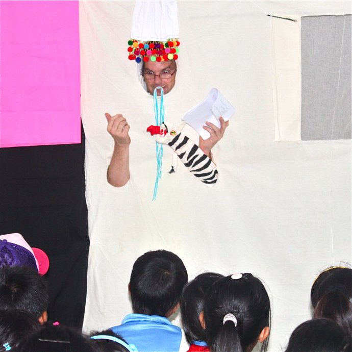乐安东在教孩子们木偶戏
