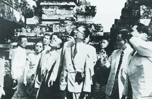 1955年,郑振铎率领中国文化代表团在印度尼西亚参观波罗浮屠(宝塔)