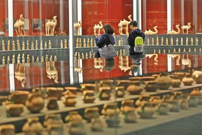 国博很少像这样布置展厅:在展厅的中心地带,上百件陶罐整齐排列在展柜中,相似造型的文物被排列在一起,颇有气势。中心展柜的四周,以“廊架”式通透展柜,分5层进行仓储式展示,摆放了百余件陶俑。