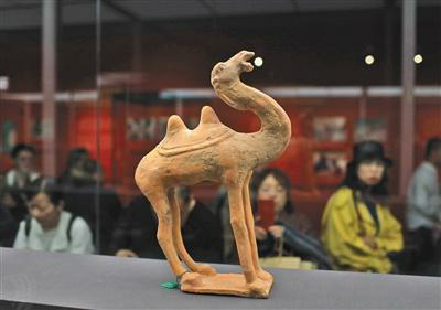 唐代陶骆驼作昂首嘶鸣状。新京报记者 浦峰 摄