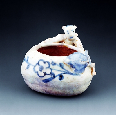元青花举世闻名,其中就有儿童题材作品。元大都遗址出土的青花婴戏鸟食罐,罐口沿处堆塑折枝桃,幼童扎双髻,俯于罐身之上,作抱罐状,纹饰简练。