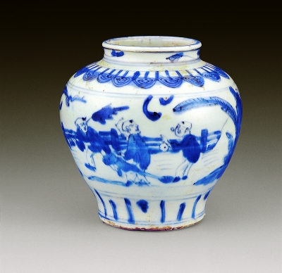 顺治青花四美十六子(亦名四妃十六子)图罐出土于海淀。主题纹饰绘于整个罐的外壁,图中一位母亲手执芭蕉扇,旁边两个小孩手捧书匣,亦步亦趋紧跟身后,俨然一幅孟母教子的历史图画;另一位母亲手执花枝与两个孩子翩翩起舞,极尽风雅和高贵;还有一位母亲怀抱婴儿,手上拉着一个稍大的孩子,同时招呼着旁边另一个孩子,颇有家族生活情调。几位母亲身后,几个调皮的孩子正在捉迷藏、玩风车。图中芭蕉亭立,柳条舞动,一轮温暖的红日隐现在氤氲的浮云之中,整个画面充满了温馨、详和的生活气息。