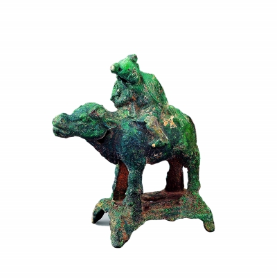 童子骑牛铜饰,童子扎双髻,骑于牛背上。让人不禁想起了“借问酒家何处有,牧童遥指杏花村”的情景。