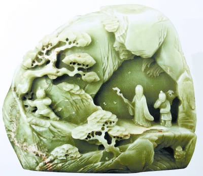 圆明园出土的青玉仙人出行山子,一老两少三人走在陡峭的山崖上。一童子在前,回首作引路状,另一童子负行李跟随老者。