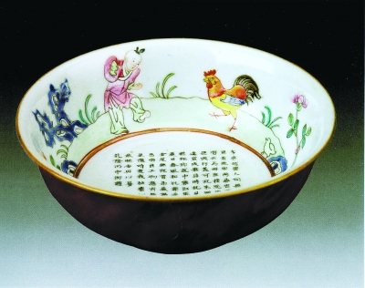 乾隆时期的粉彩鸡缸杯仿成化斗彩鸡缸杯。乾隆皇帝一生喜欢作诗,喜欢将他的诗文与花鸟或山水图案相结合作为瓷器的画样,命御窑厂烧造。画中的童子紫衣白裤,左手引鸡,抬左腿,画面生动自然。