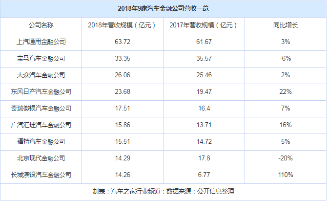 日前,多家汽车金融公司发布2018年报,不同于销量低迷的车企现状,大部分汽车金融公司在2018年业绩明显增长,其中,上汽通用汽车金融以63.72亿元的经营收入排名第一,宝马汽车经营收入总额排名第二,但相比去年同期下滑6%。