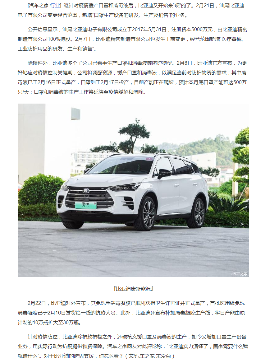 “硬”支援 比亚迪将造口罩生产设备