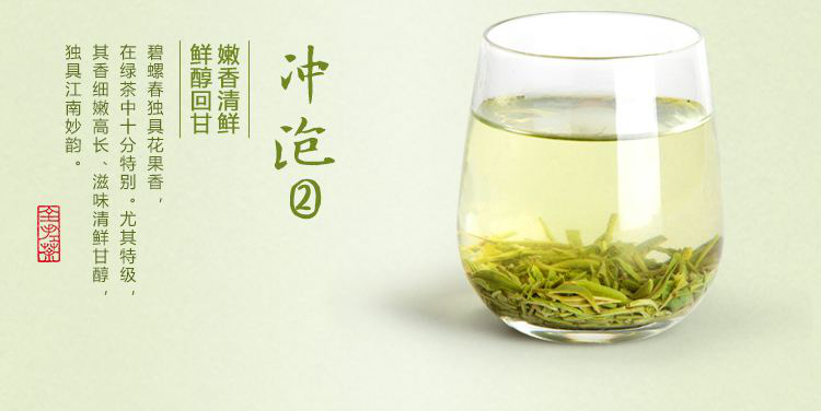 2、碧螺春——产于太湖东洞庭山及西洞庭山(又称东山和西山),因其外形条索紧结,白毫显露,色泽银绿,翠碧诱人,卷曲成螺,汤色清澈明亮,浓郁甘醇,鲜爽生津,回味绵长,叶底嫩绿显翠。