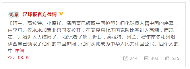 据记者了解,近日,高拉特、阿兰、费尔南多和阿洛伊西奥已领取了他们的中国护照,他们从此成为中华人民共和国公民。屈指一算,目前中国已经有9名入籍球员,他们是李可、侯永永、德尔加多、艾克森、布朗宁(蒋光太),高拉特、阿兰、费南多和阿洛伊西奥。